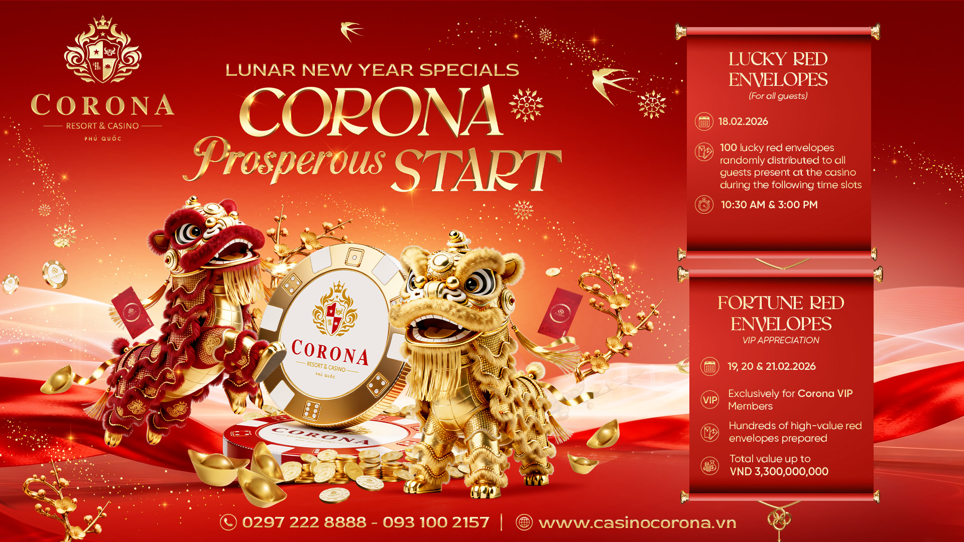 On the occasion of the Lunar New Year 2026, Corona Casino Phu Quoc sincerely wishes our esteemed guests and their families a New Year filled with Peace, Prosperity, and Fulfillment of Wishes.