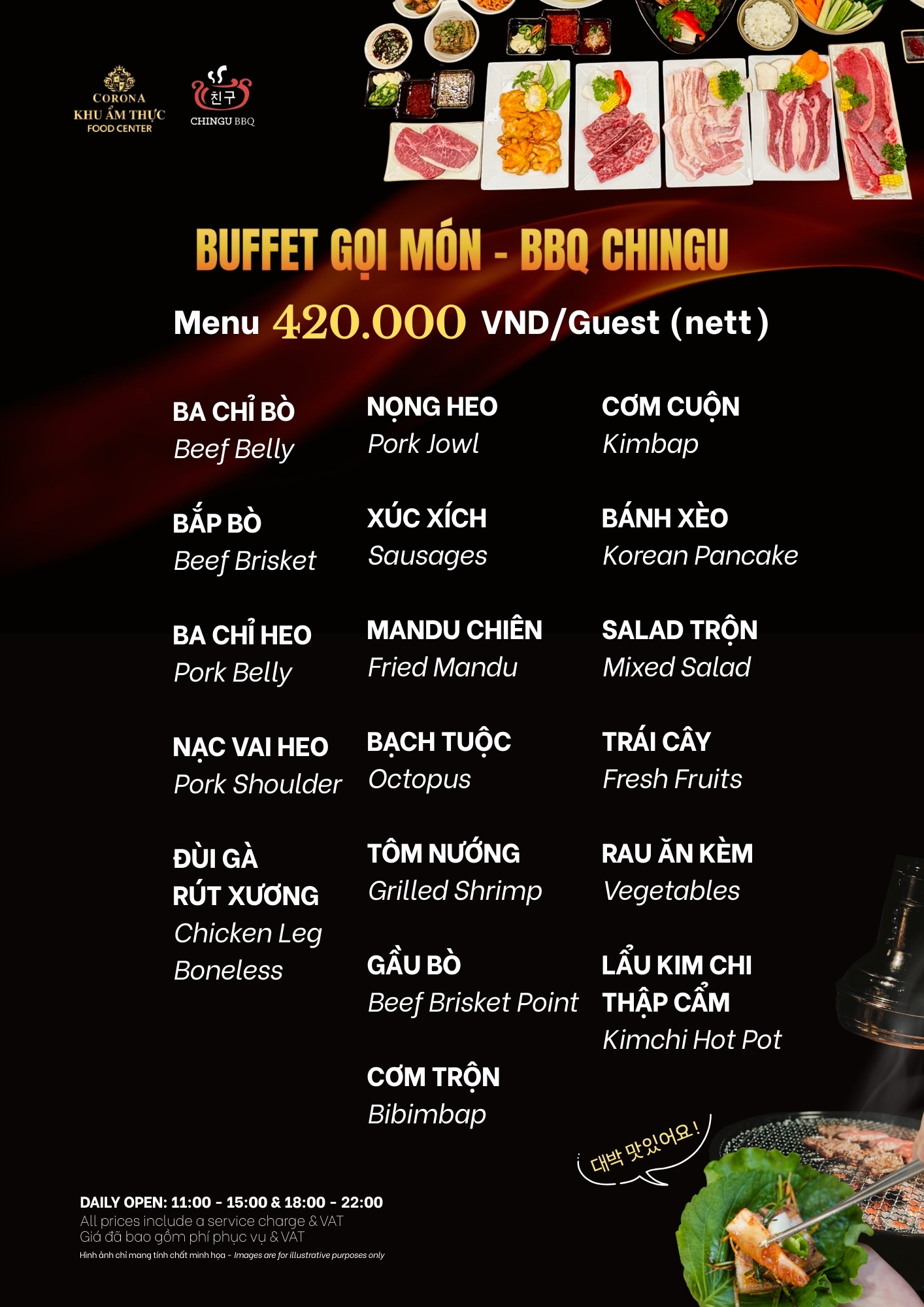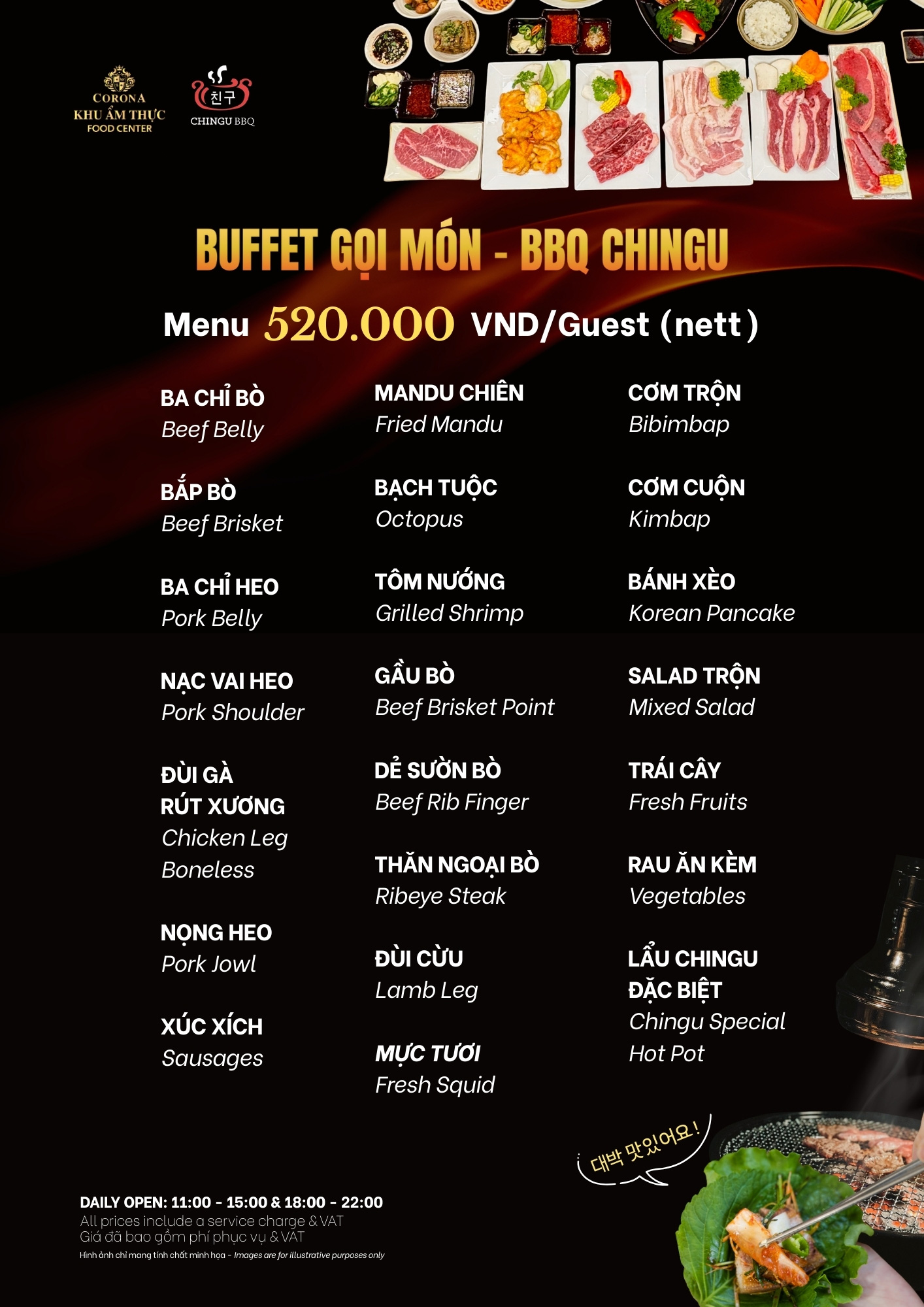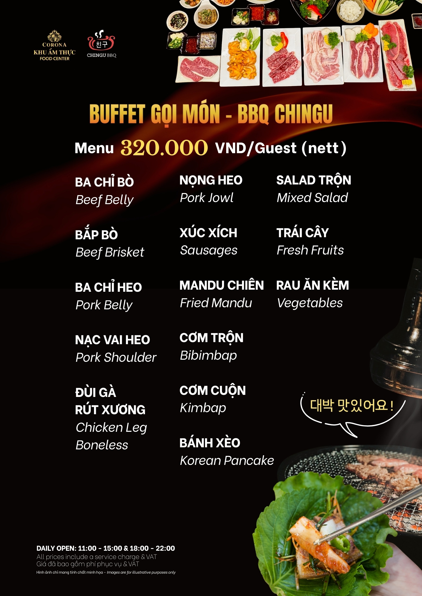 Chingu restaurant owns a modern comfortable space with simple wooden tables equipped with smokeless grill system, will definitely be the ideal destination for diners to enjoy attractive and delicious Korean dishes.